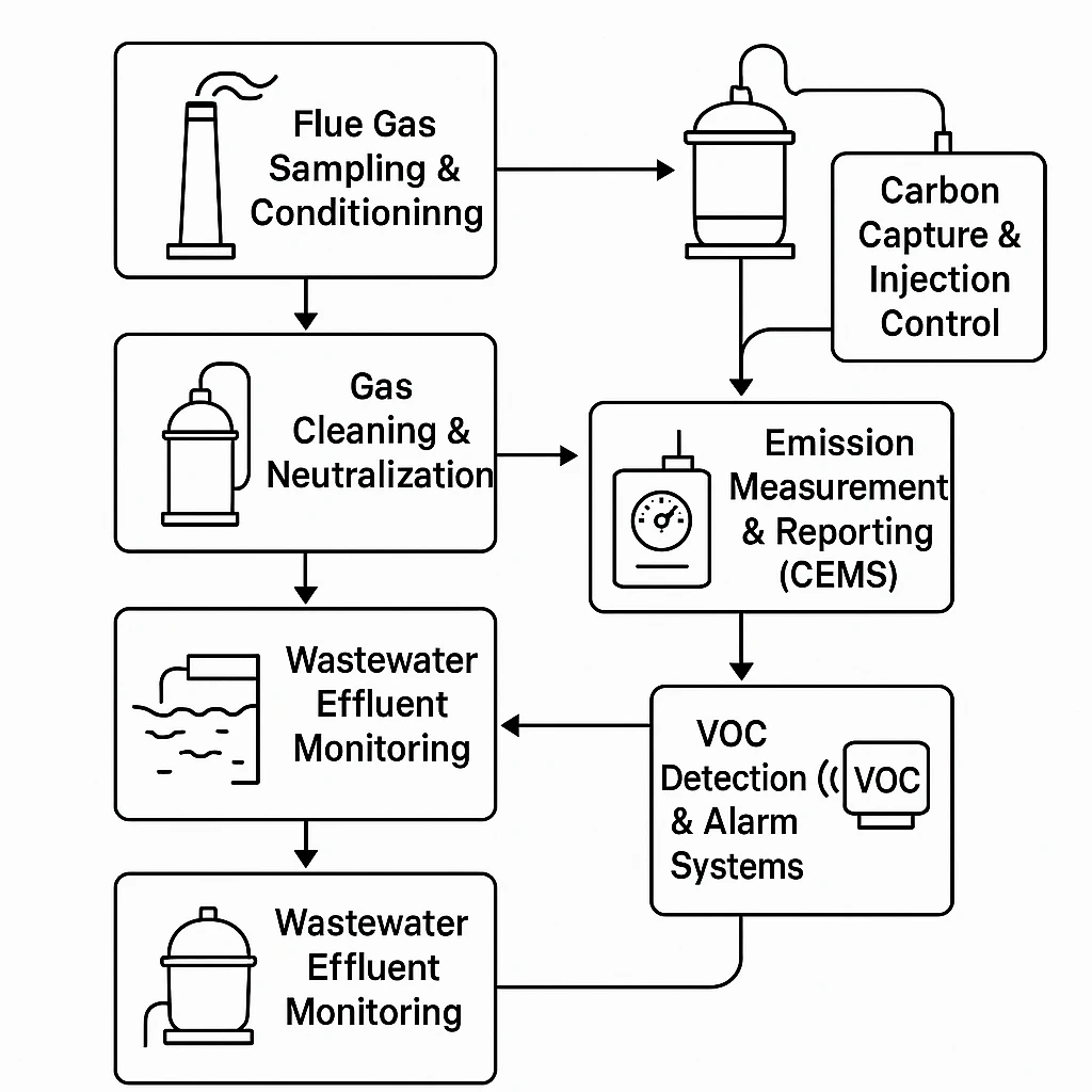 Environmental and emission control systems integrate multiple parallel processes—including gas treatment, wastewater monitoring, VOC detection, and carbon capture—where precise instrumentation ensures reliable data, regulatory compliance, and efficient plant operation.
