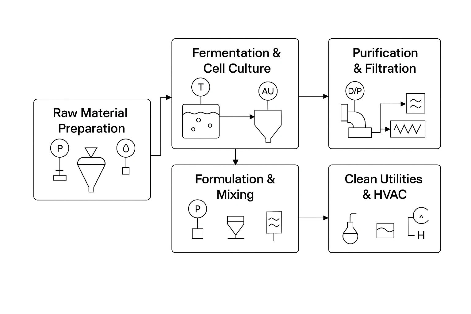 Pharmaceutical and biotech processes demand exceptional cleanliness, precision, and validation. Advanced instrumentation supports these requirements with high accuracy, traceability, and reliable digital communication under GMP and FDA regulations.